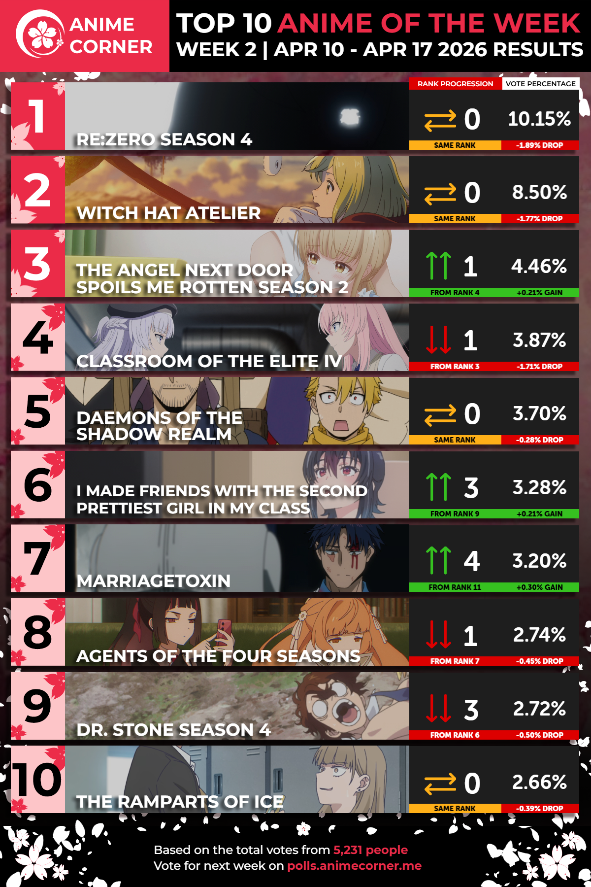 通过对来自世界各地的5231名动漫爱好者的投票进行统计,欧美动漫网站Anime Corner公布了2026年春季动画第二周的投票结果(统计时间:4.10~4.17)。因为Anime Corner的排名是基于用户投票,所以这个结果仅代表某些动画在该平台用户中的受欢迎程度,建议大家还是根据自己的喜好选择动画进行观看。