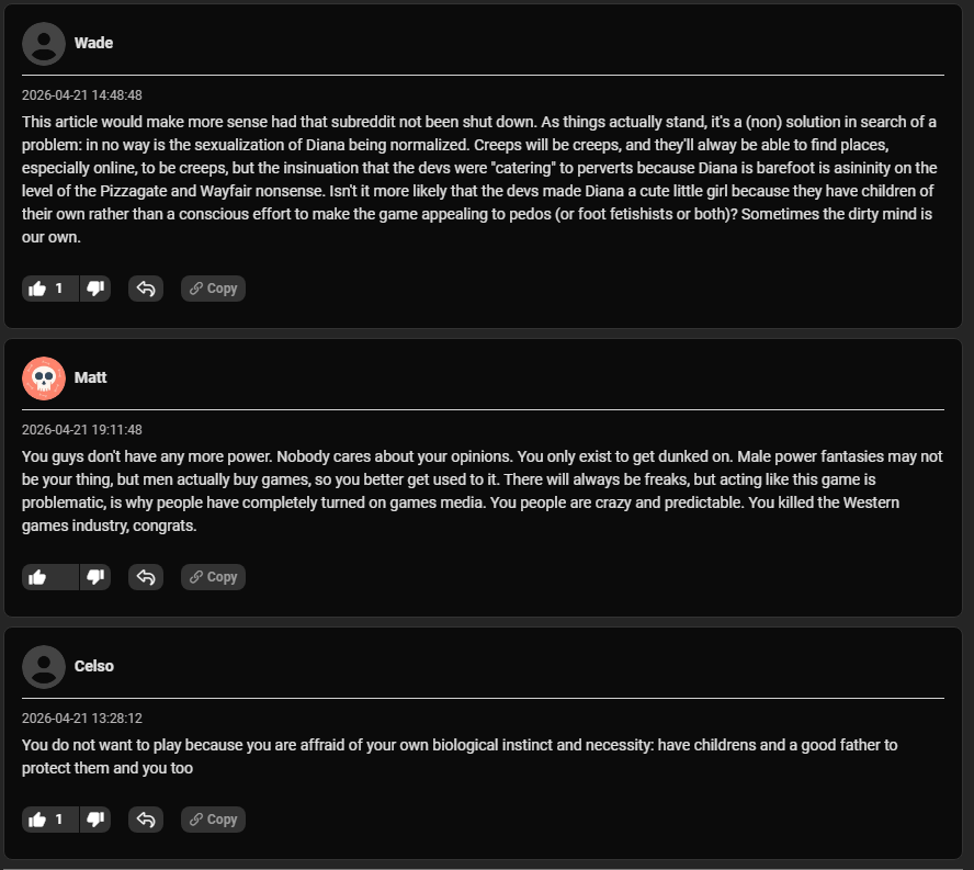 然而,这篇充满忧患意识的评论却并未收获一边倒的认同,反而在玩家群体中激起了同样强烈的反弹声浪。持反对意见的玩家普遍认为,《TheGamer》的论证逻辑有以偏概全之嫌,其将少数极端粉丝的越轨行为上升至对整个玩家文化的指控,无异于凭空制造靶子。一位网友直言不讳地评价道:“这完全是一个被媒体凭空放大的‘不存在的问题’。”更有玩家从游戏设定本身出发进行辩护,指出戴安娜在游戏中赤脚行走的设计,很可能只是出于其作为生化人需通过足部接触进行能量补给的功能性考量,而非媒体所暗示的刻意迎合某种隐秘癖好。