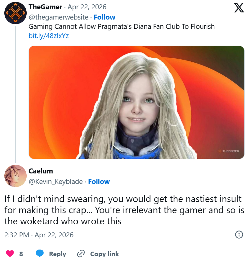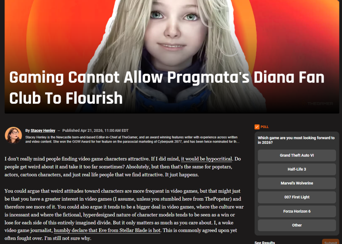 《TheGamer》编辑Stacey Henley在文中措辞犀利地指出,戴安娜这一角色形象已在部分玩家社群的二次创作中严重越界,相关不当内容甚至直接导致Reddit平台的相关讨论版块因触及未成年人性内容红线而遭到官方封锁。在作者看来,这绝非个别边缘群体的自娱自乐,而是某种令人不安的趋势正在从暗处走向公开化的危险信号。文章进一步批评了当下网络文化中一种近乎病态的惯性——将一切角色“性化”,并以此为标尺,对那些不迎合此种风气的作品贴上意识形态标签,进而将本该围绕游戏玩法与叙事的讨论,撕裂为一场场无休止的文化对立。