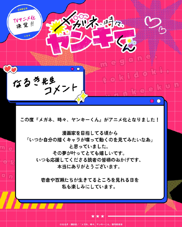 由なるき创作的漫画《眼镜仔、偶尔、是不良》正式宣布TV动画化,原作者なるき的祝贺插画公开。