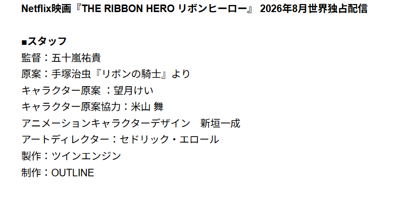 如今,这部跨世纪的经典之作将由Netflix全新改编为动画电影《THE RIBBON HERO》,并正式定档于2026年8月全球独家播出。前导视觉图与核心制作阵容也同步揭晓。