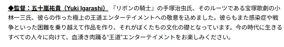 导演五十岚祐贵表示,这部作品既是向手冢治虫的致敬,也追溯至手冢的创作根源——宝冢歌剧创办人小林一三。他希望打造一部“热血且正统”的娱乐作品,将这份跨越时代的文化馈赠传递给新一代观众。