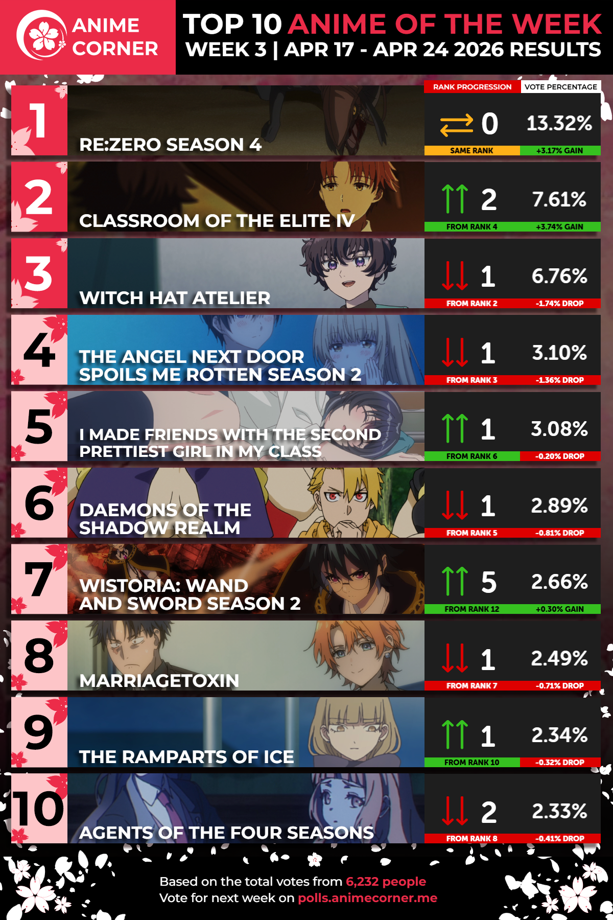 通过对来自世界各地的6232名动漫爱好者的投票进行统计,欧美动漫网站Anime Corner公布了2026年春季动画第三周的投票结果(统计时间:4.17~4.24)。因为Anime Corner的排名是基于用户投票,所以这个结果仅代表某些动画在该平台用户中的受欢迎程度,建议大家还是根据自己的喜好选择动画进行观看。