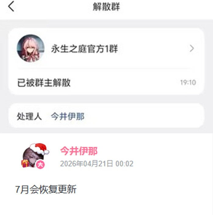 国G再次暴雷?众筹42万的国产Galgame《永生之庭》作者今井伊那解散官方QQ群,b站账号发文称将在7月恢复更新。