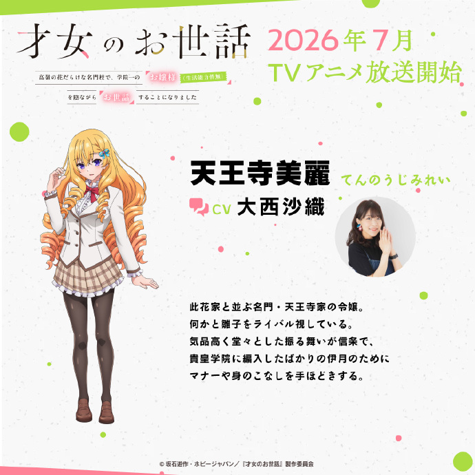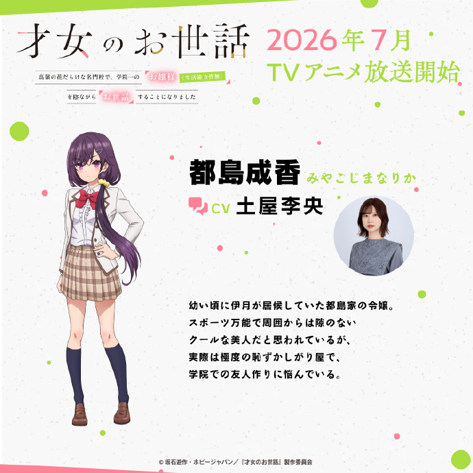 TV动画《才女的侍从 在满是高岭之花的贵族学校暗中照顾(毫无生活自理能力的)学院第一大小姐》公布了追加声优阵容及主视觉图。